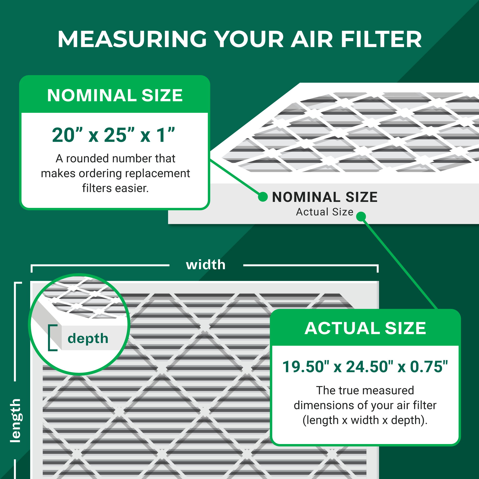 • The rounded size printed on your filter or HVAC unit (e.g., 20x25x1).