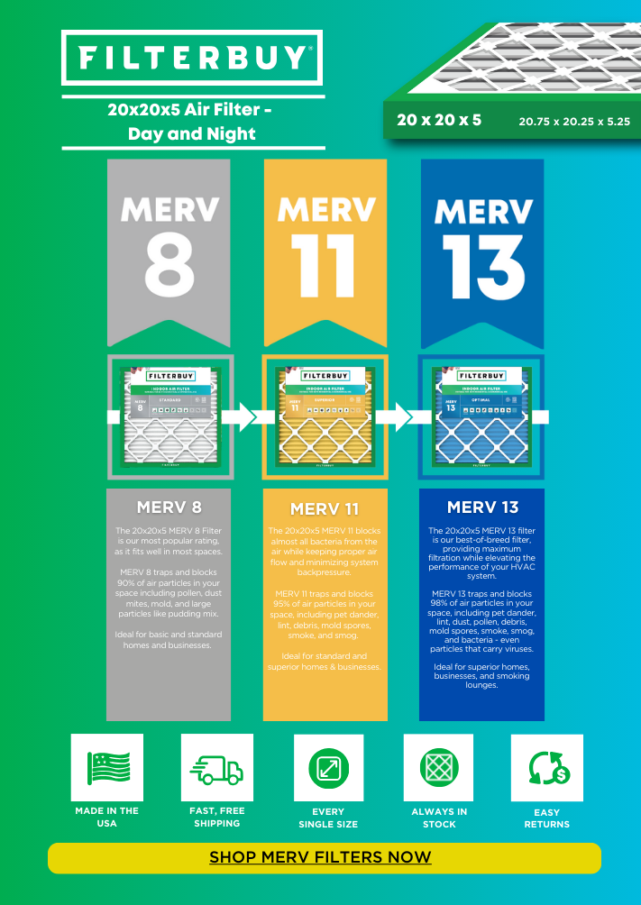 Your Day and Night system deserves a filter built to keep up with everything moving through your air. Shop Filterbuy's MERV 11 20x20x5 replacement at filterbuy.com and see why over two million households count on it, with free shipping and quantity discounts on every multi-pack purchase. After more than a decade of American manufacturing, we build every filter to protect what matters most.