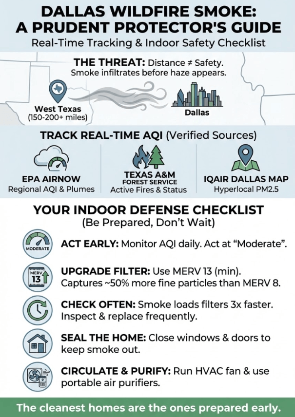 Stop asking "Is there a wildfire near Dallas today?" Start asking "Is my home ready?" The right preparation before smoke arrives determines your family's air quality outcome: