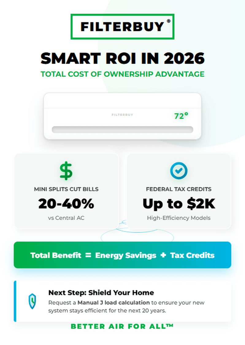 Filterbuy filter compatibility note: Filterbuy units use thin mesh filters that need monthly cleaning in homes with pets or allergy sufferers. A MERV 8 supplemental filter at the return grille cuts the fine particulate load on the system and extends the time between cleaning cycles.