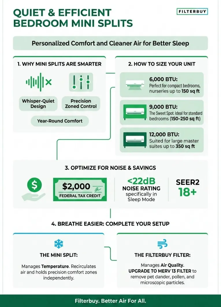 At 3 a.m., a rattling air conditioner isn't a cooling problem. It's a sleep problem. The right mini split fixes it — and does a lot more than keep things quiet. The best bedroom mini splits run at whisper-soft noise levels, hold your target temperature with real precision, and give you full control over one room without touching the rest of the house. This guide covers what actually matters: how to size the unit correctly, how to read noise ratings honestly, and why the air filter in your central HVAC system matters just as much as anything mounted on your wall.