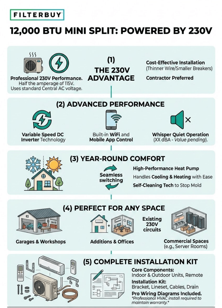 The Filterbuy 12,000 BTU ductless mini split in 230V is built for rooms up to 300 sq ft and the professionals who install them. Variable speed efficiency, app control, and air quality expertise that only Filterbuy delivers. Free 2-day shipping. 5-year compressor warranty. Everything your contractor needs, in one box.