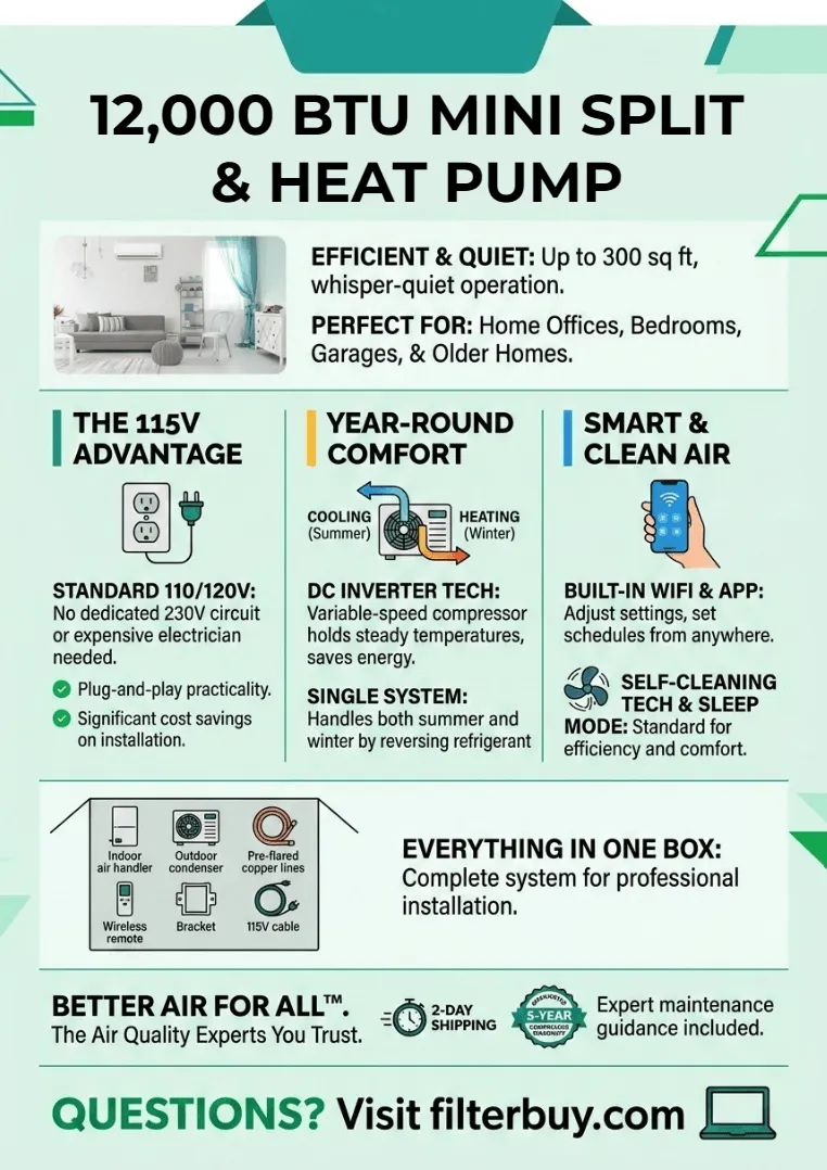 The Filterbuy 12,000 BTU ductless mini split delivers professional-grade heating and cooling for rooms up to 300 sq ft, powered by a standard 115V outlet and backed by air quality experts. Free 2-day shipping and a 5-year compressor warranty. Everything your contractor needs is already in the box.