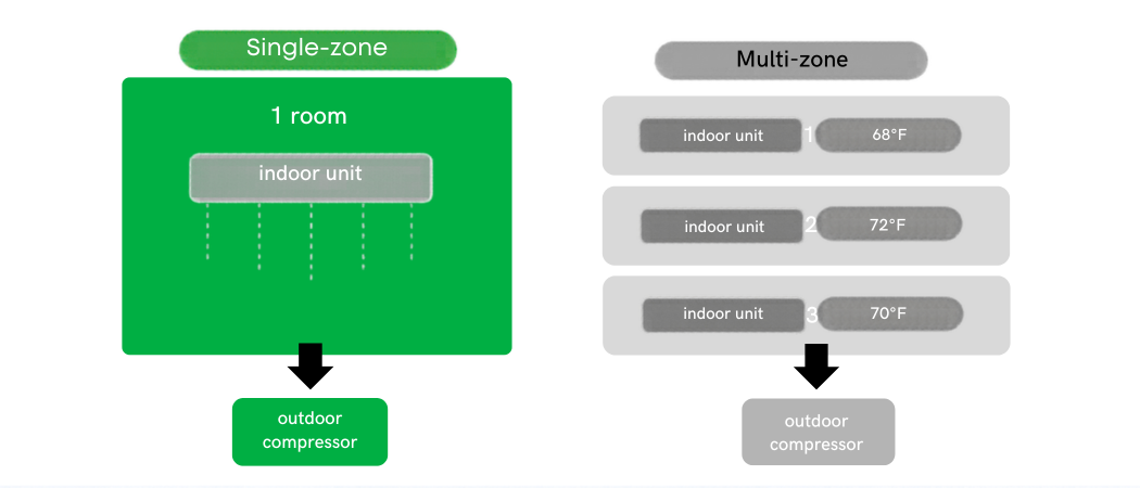 Single-Zone Systems: Ideal for cooling or heating a single, dedicated space with one outdoor compressor connected to one indoor unit.