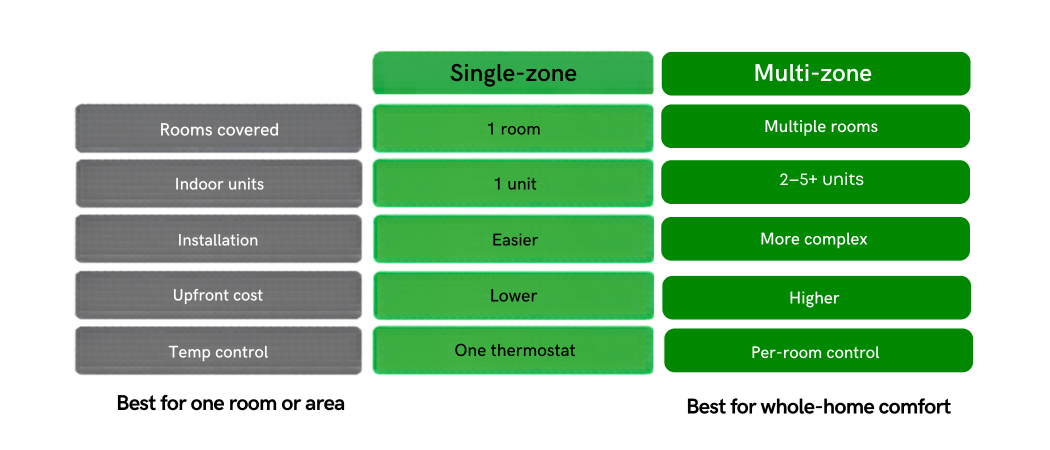 A single-zone setup is your best bet when you are dealing with isolated temperature issues. If you have a garage conversion, are upgrading a home office, or want to add comfort to a sunroom without modifying your central HVAC, this is the way to go.