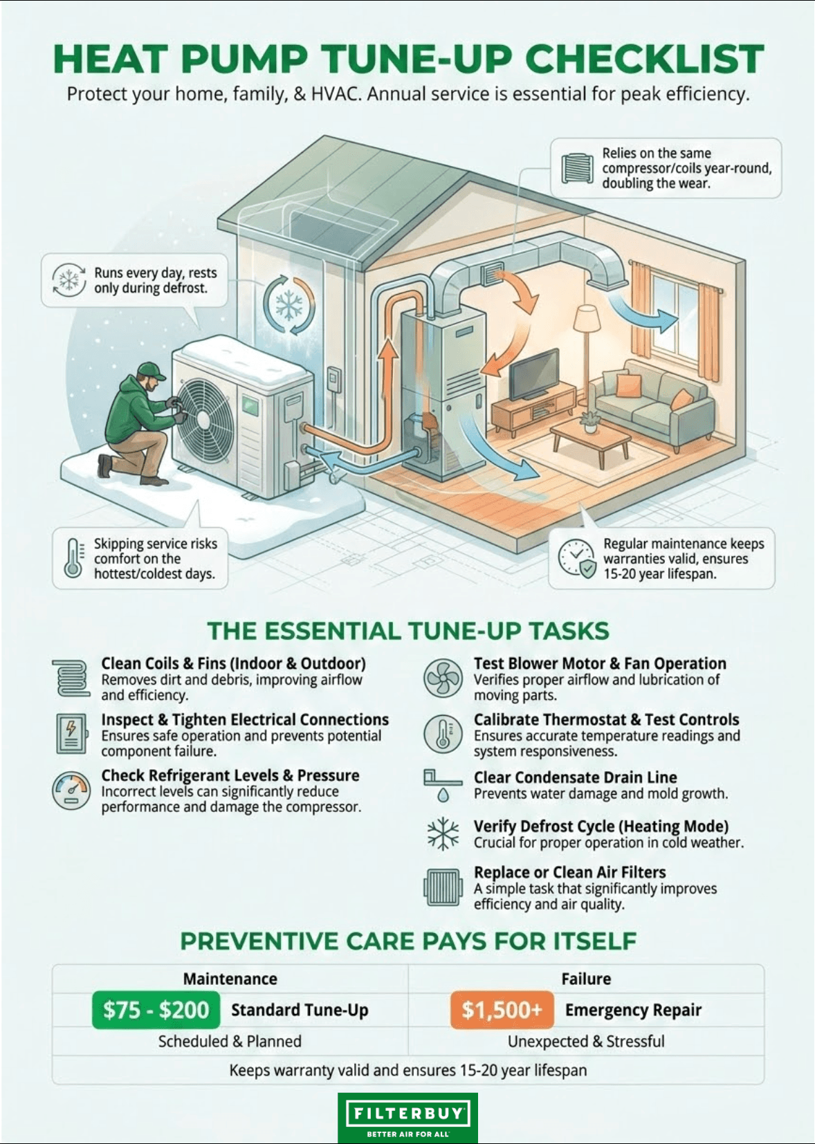 The difference in energy consumption between a well-maintained heat pump and a severely neglected one can range from 10% to 25%, according to the U.S. Department of Energy. That gap is exactly what an annual tune-up keeps closed. Source: U.S. Department of Energy, Operating and Maintaining Your Heat Pump (energy.gov/energysaver/operating-and-maintaining-your-heat-pump).