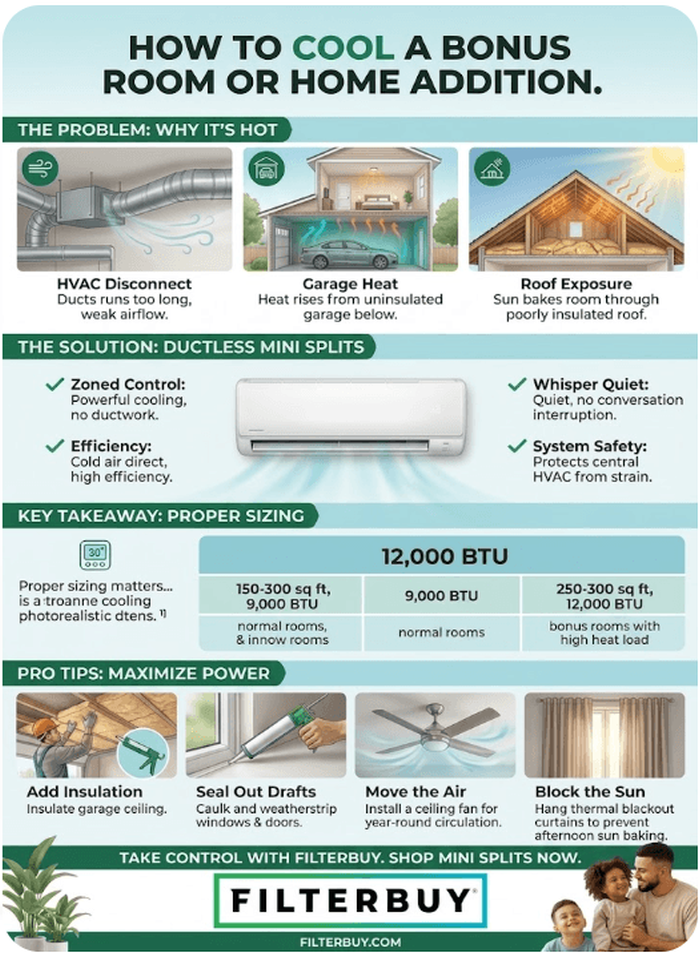You do not have to abandon your bonus room every time the summer heat rolls in. By acknowledging the unique structural challenges of rooms over garages and home additions, you can implement a targeted, highly effective solution. Step away from noisy window units and risky ductwork extensions. Invest in a ductless mini split system, improve your room's insulation, and reclaim your home's square footage today. Shop energy-efficient mini split systems with fast, free shipping with Filterbuy and upgrade your bonus room comfort today.