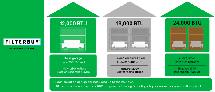 24,000 BTU: Covers up to 500–550 sq ft and is best for 2-car garages or larger spaces. (Requires 230V)