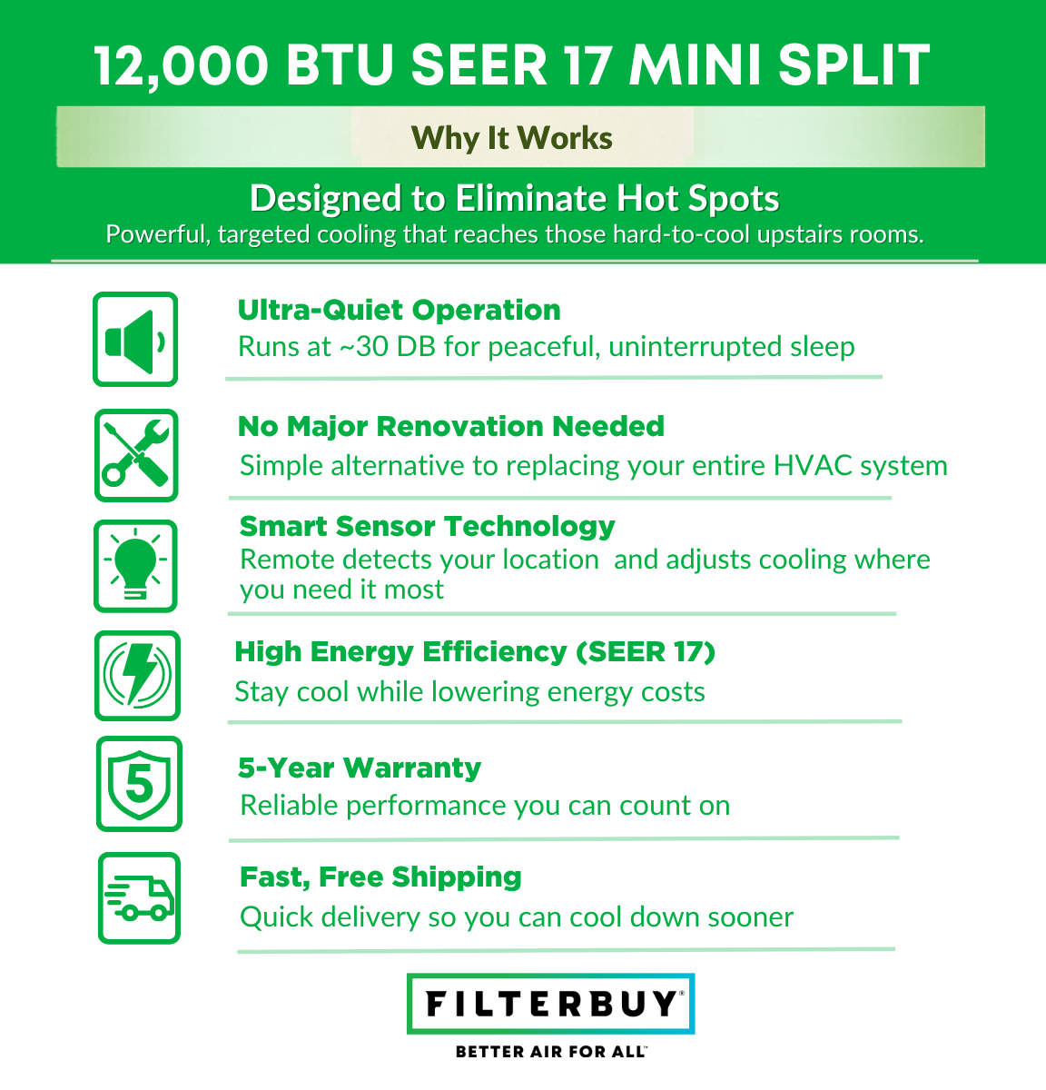 If you are looking for a simple, effective fix without redoing your entire HVAC system, we highly recommend the Filterbuy 12,000 BTU SEER 17 Mini Split.