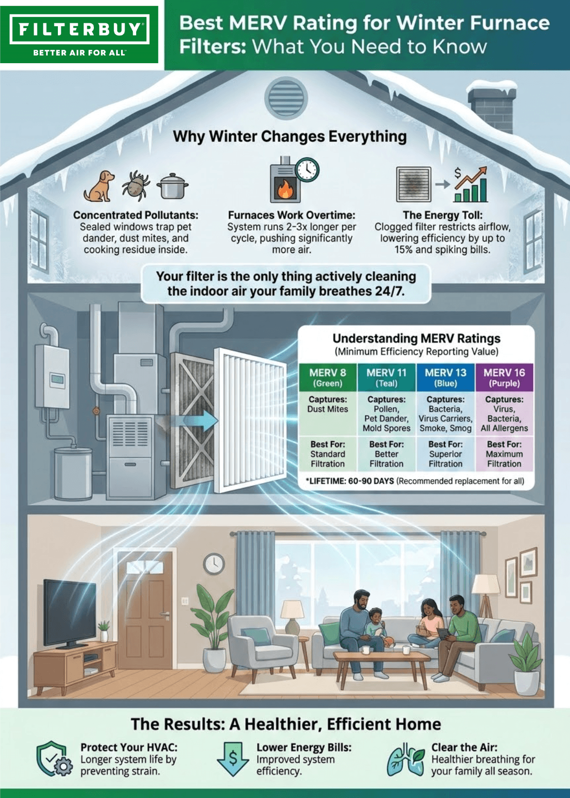 Winter is different from the rest of the year. Sealed homes concentrate indoor pollutants and your furnace runs two to three times longer per cycle, which makes the filter you pick now your home's only active defense for indoor air through March. Confirm your HVAC system supports the rating before upgrading. Most systems built after 2010 handle MERV 13 without issue.