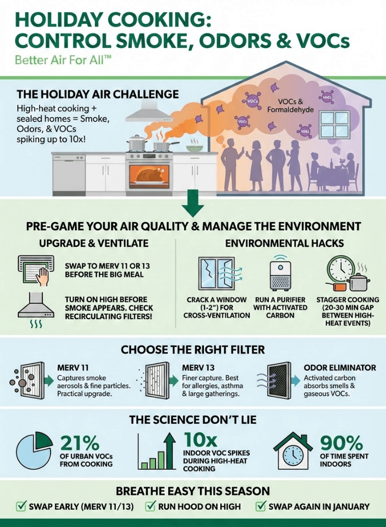 Holiday cooking pushes indoor air quality in ways a normal Tuesday dinner never does. Every time you fry, roast, or sauté at high heat, you release visible smoke, cooking odors, and invisible gases called volatile organic compounds — VOCs — all at once. Longer cook times and higher heat mean your exposure on a single holiday is meaningfully higher than on an average weeknight.