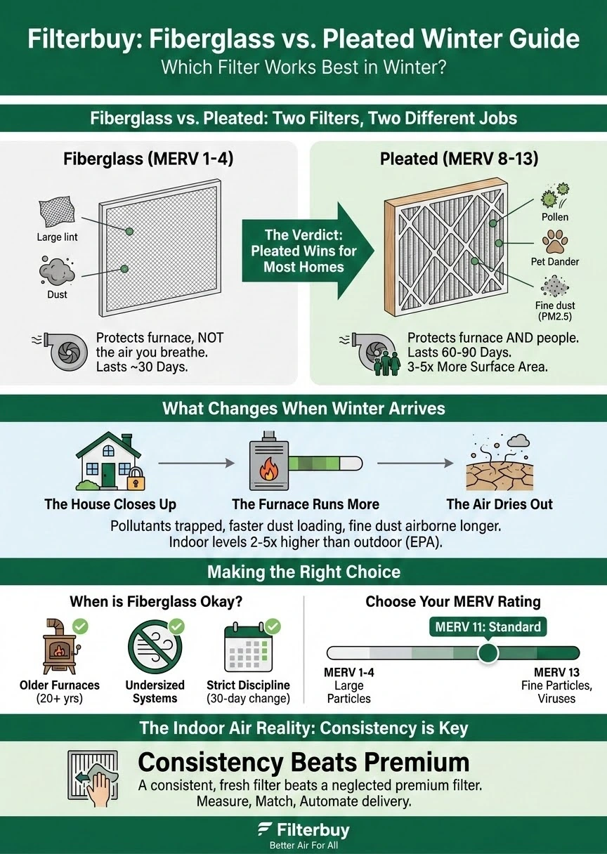 The real winter filter mistake isn't choosing fiberglass over pleated. It's forgetting to change whichever one you picked. A consistent cheap filter beats a neglected premium filter every single time.