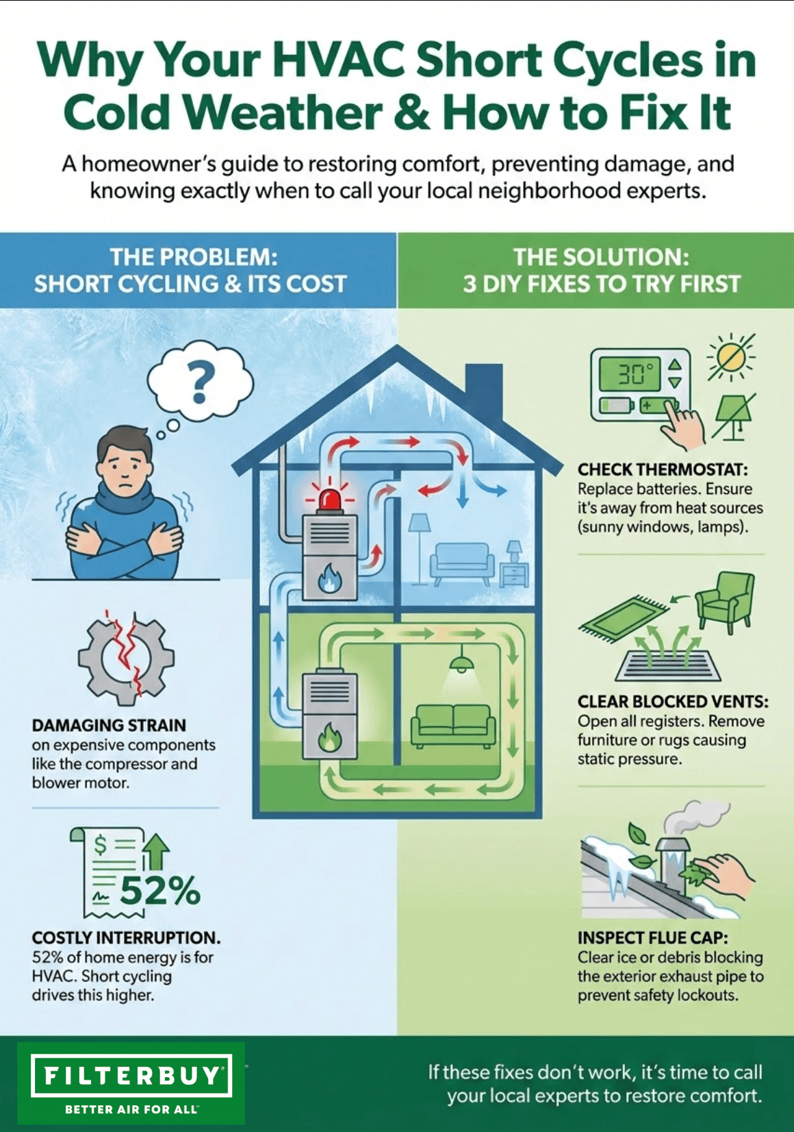Thermostat set to 68. Your furnace kicks on, runs two minutes, shuts off. Kicks on again. Shuts off. The house stays cold while your system wears itself out on repeat. That pattern has a name: short cycling. And in most cases, your air filter is the reason.